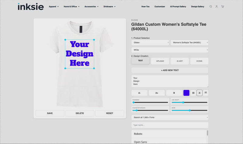 Design your perfect personalized shirt with the Gildan Women's Softstyle Tee (64000L), the ideal canvas for your custom logos, photos, and unique text designs. Crafted from ultra-soft 100% ring-spun cotton for a modern, comfortable, semi-fitted look, this durable tee provides a smooth, high-density surface perfect for your decoration. As your trusted local home for custom apparel, Inksie simplifies the process with no order minimums. Every personalized item is produced right here in the US for fast delivery, a smaller carbon footprint, and the easiest customizer experience you'll find.